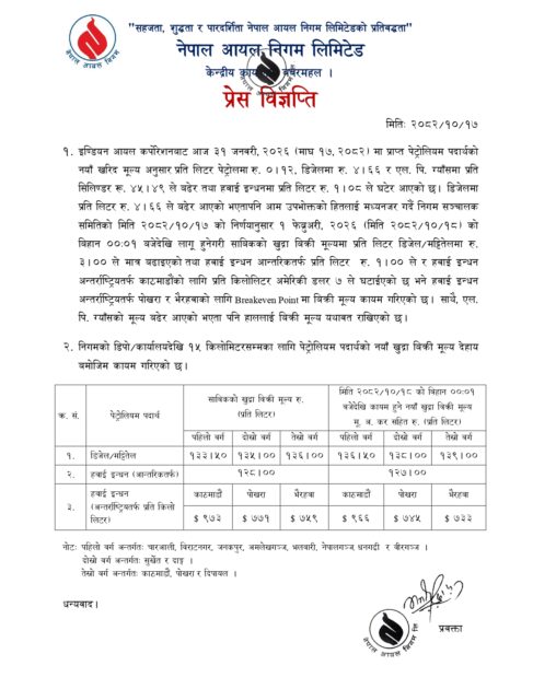 यस्तै, निगमले पेट्रोल र खाना पकाउने ग्यासको मूल्य यथावत राखेको छ भने हवाई इन्धन आन्तरिक र बाह्य दुवैतर्फको मूल्य घटेको छ। निगमकाअनुसार डिजेल र मट्टीतेलको मूल्य लिटरमा ३ रुपैयाँले बढाइएको छ ।