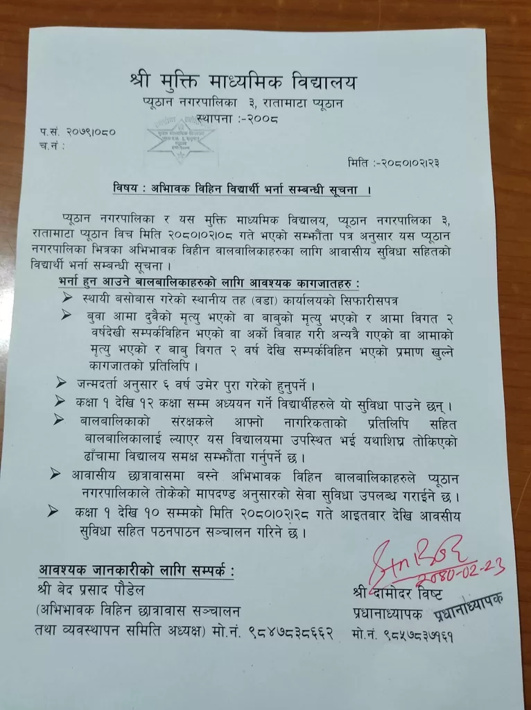प्युठान । जिल्लाको प्युठान नगरपालिकाद्वारा अविभावक विहिनलाहरुलाई निशुल्क शिक्षाको व्यवस्था गरिदिएको छ । प्यूठान नगरपालिका र प्यूठान नगरपालिका वडा न-३ मा रहेको मुक्ति माध्यमिक विद्यालय रातामाटा बिच २०८० जेठ ८ गते सोमवार भएको सम्झौता अनुसार प्यूठान नगरपालिका भित्रका अभिभावक बिहिन बालबालिकाहरुका लागि आवासिय सुविधा सहितको निशुल्क विद्यार्थी भर्ना अभियान शुरु भएको हो ।