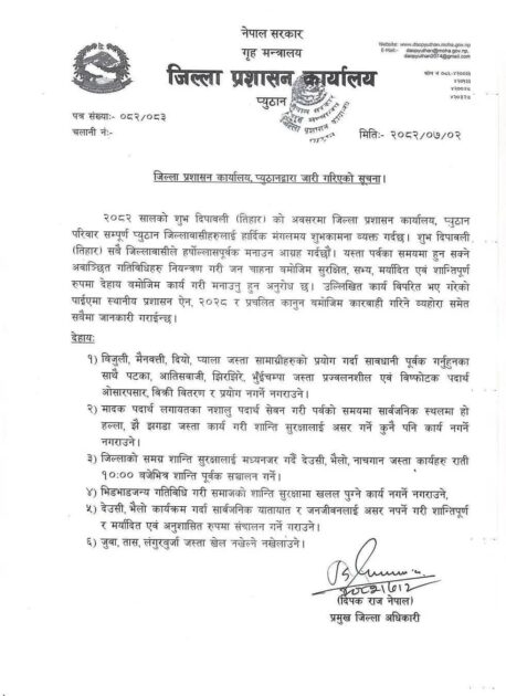 प्रशासनले तिहारमा पटकालगायतका विष्फोटक पर्दाथ बिक्रीवितरण तथा प्रयोगमा पनि रोक लगाएको छ ।