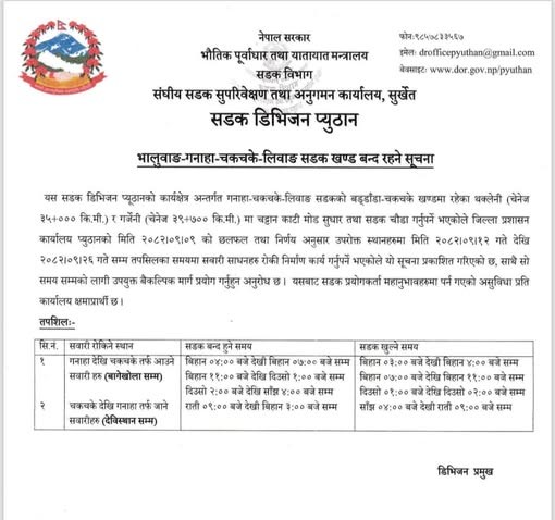 प्युठान।सडक चौडा गर्नका लागि भालुवाङ – गनाह–चकचके– लिवाङ सडक खण्ड  बन्द हुने भएको छ।सडक डिभिजन कार्यालय प्युठानले एक सूचना जारी गर्दै यस क्षेत्रको सडक बन्द हुने जानकारी दिएको हो।