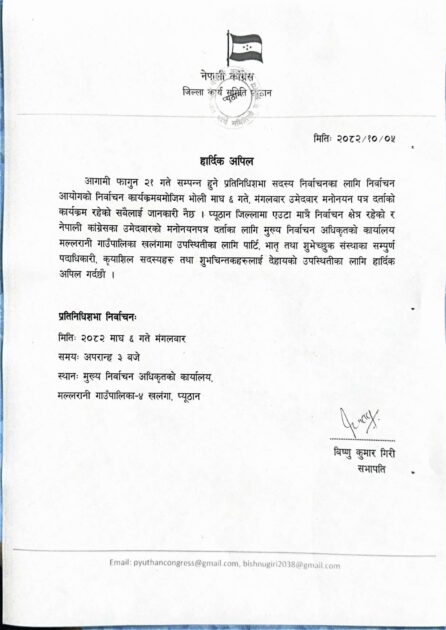प्युठान।नेपाली कांग्रेस प्युठानले फागुन २१ गते हुने प्रतिनिधि सभा सदस्य निर्वाचनका लागि आज हुने उम्मेदवारी मनोनयन दर्ता कार्यक्रममा सहभागिता जनाउन सबैलाई आह्वान गरेको छ।