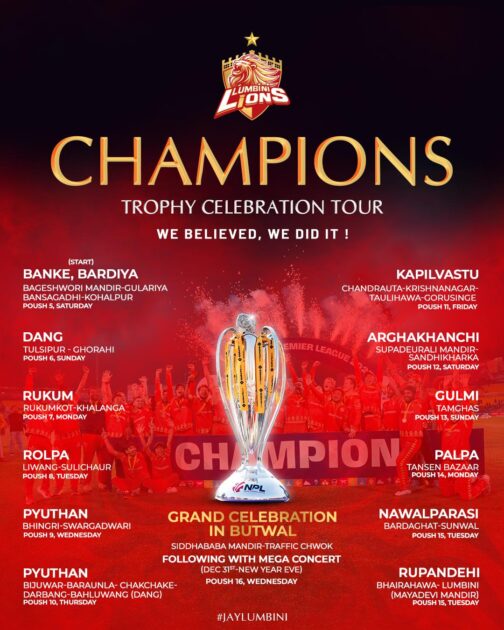 लुम्बिनीले सामाजिक सञ्जालमार्फत लुम्बिनी प्रदेशका विभिन्न स्थानमा उत्सवका साथ ट्रफी पुर्याइने जनाएको हो।टूर आउँदो शनिबारदेखि सुरु हुँदैछ।